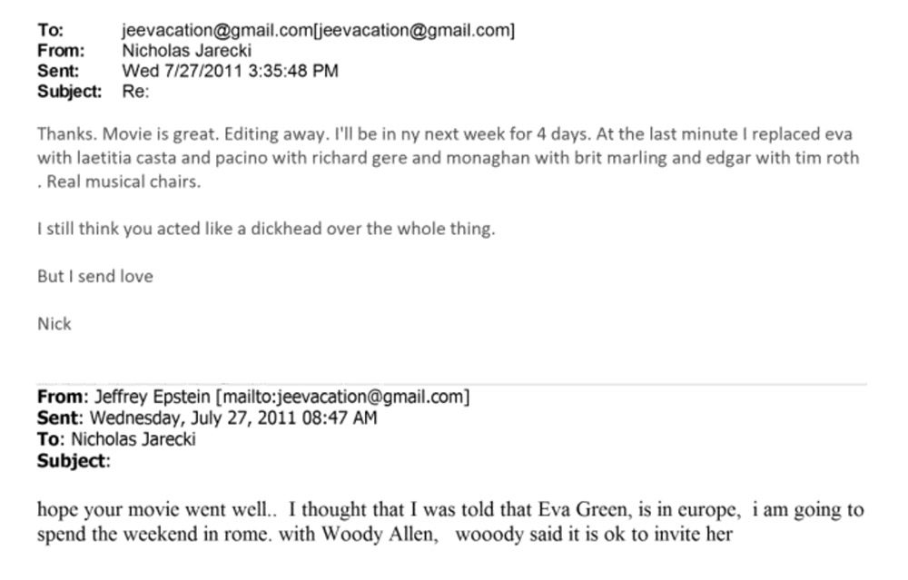 EPSTEIN: hope your movie went well.. I thought that I was told that Eva Green, is in europe, i am going to spend the weekend in rome. with Woody Allen, wooody said it is ok to invite her